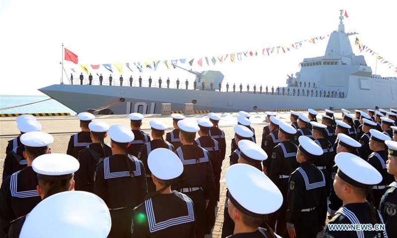 | Foto tirada em 12 de janeiro de 2020 mostra a cerimônia de comissionamento do Nanchang, o primeiro destroier de mísseis guiados Tipo 055 da China, na cidade portuária de Qingdao, província de Shandong, leste da China. A comissão de Nanchang marca o salto da Marinha da terceira geração para a quarta geração de destruidores, de acordo com um comunicado da Marinha. (Foto: Li Tang/Xinhua) |